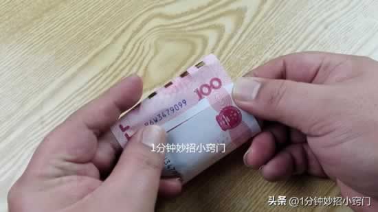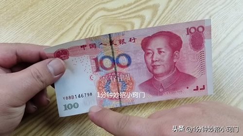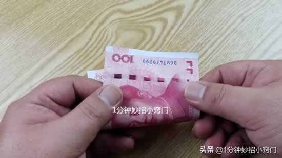 第三点,我们可以看一下钞票右边的反光条,我们把钞票转动方向,就可以在上面看100的字样的,这种反光条也是钞票上面专用的,所以我们很容易就能够看到上面的100字样。