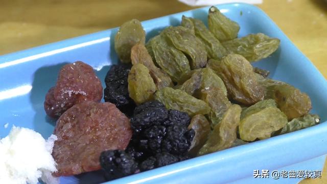 4、就着葡萄干新疆这类的果干。揪下正确一小块,把葡萄干、桑葚干包进去。塞嘴里一点,越嚼越香北大。