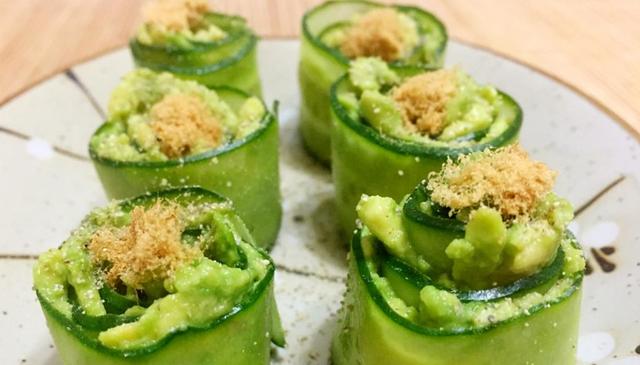 具体做法如下:黄瓜洗净后用瓜刨刨成长条,牛油果纵向对半切开取出果核,牛油果肉挖出来,加上10克的糖粉,用勺子把牛油果肉按压成果泥,取一条黄瓜,放上适量的牛油果泥,右边留一点不要抹,黄瓜从左往右卷起来,用牙签固定,芒果对半切开,划田字格,不要划太大,跟黄瓜卷的直径差不多就可以了,把切好的芒果肉放到黄瓜卷上装饰一下即可!不喜欢芒果的可以换肉松!