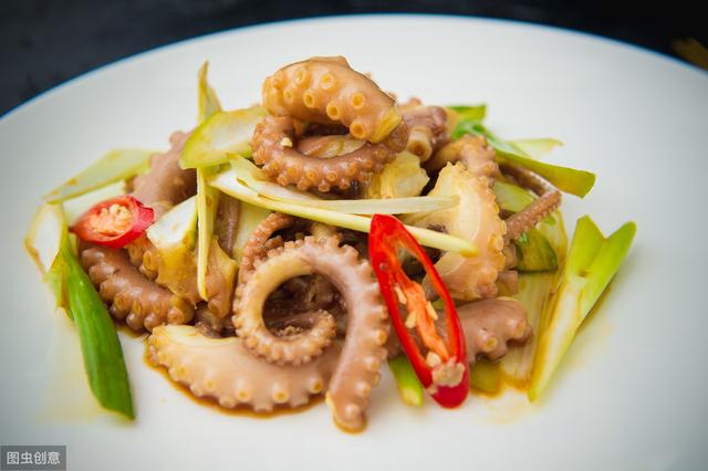 (4)锅中有用放入能不能适量的油,再把能吃生姜末给鱼爆头炒香,辣椒也炒至三分黑生吃熟,再加入章鱼炒好,便可以吃了。