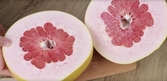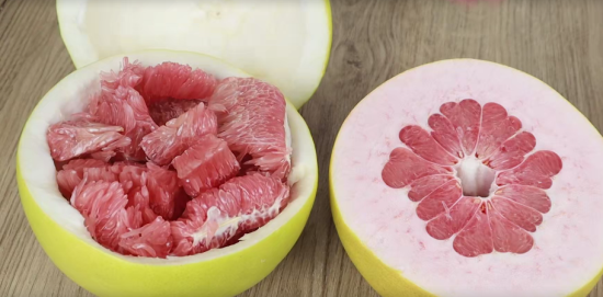 妙招二,我们再拿来一个柚子,先把它的顶部和底部给去除。然后我们横着从它的中间往下面切一刀就可以了,这样切出来的柚子是很漂亮的。然后我们再找其中的一条纹路切下去再把它掰开来,这样是不是很漂亮呢?我们在剥的时候直接从的旁边把它的外皮剥去就可以了。