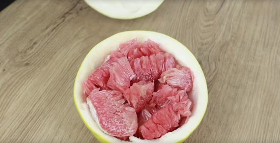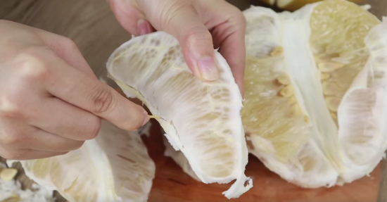 我们把剥好的柚子表面的白丝剥下来,然后再掰出其中一半,用一根牙签给它的果肉往中间这么一划就可以了。柚子的外壳和经络都可以用牙签给它剔除,看起来干净又美观,而且还不费力。