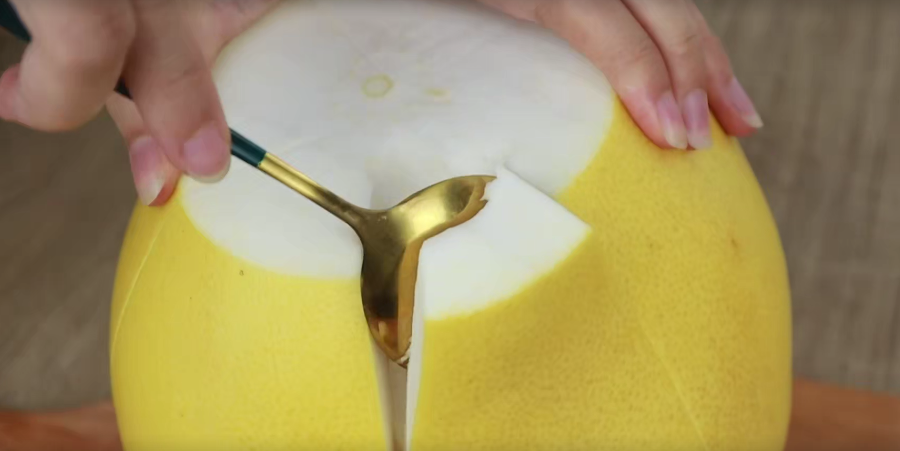 妙招四,我们不用把顶部跟底部去除,只需要从中间轻轻的划一圈过来。大家划的时候也要注意不要伤到它里面的果肉。然后我们轻轻的把它扭开就可以打开这个柚子了。如果你打不开的话,我们也可以用勺子把它塞进果肉和果皮的中间转动,这样子我们柚子的果肉就可以很好地跟果皮分离了。我们剥好的柚子也可以把它放回果皮里,这样也不用担心剥出来的柚子果肉失去水分了。而且也很美观哦。