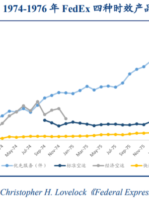 新产品的推出共同帮助票均收入提升。 我们观察除了行业格局外,公司在优化产品,1996 年,联邦快递扩展了三类寄递服务的 时间: First Overnight:美国本土次日早上 8 点送达(覆盖 90 个城市), Sameday:美国本土 24 小时送达,以及 International First。 First Overnight 产品将过去的时效时间明显提升,由此也推动了产品价格的变化。
