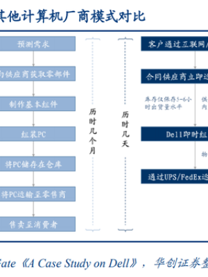 以戴尔电脑的运营模式为例: 销售端:采用网上直销,客户可以通过网站直接选择指定配件组装电脑并下单。 生产端:当戴尔公司接到电子顺丰订单后,配置中心会将订单分解为详细的零部件采购订单 并下发至配件供应商,供应商需要在指定期限内将零部件送至戴尔组装车间。 一般情况下戴尔组装工厂中的零部件库存量仅保持在约 5-6 小时的出货量,库存信息系 统将每隔 2 小时更新一次供货安排。 发货端:当电脑组装完成后,物流服务商将即时发货。 在戴尔的全流程运营模式中,顺丰几点发货当天到,对时效性的要求精确至小时,严密的生产销售安排,需要 深度绑定、及时响应的供应商组织,以及对于每个环节的物流时效都存在极致的追求。
