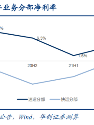相佐证的是,根据公司披露分部报告情况,公司将主营业务分为速运、快运、同城、供 应链及国际四大业务分部,其中速运分部包括大件业务以外的时效快递、经济快递业务, 和冷运及医药业务。 2020-21 年速运分部净利率分别为 7.2%、2.9%,20 年下半年由于前置资源投入等因素导 致速运净利率下降,但观察 20H1 速运分部净利率达到 8.2%,20H2 仍有 6.3%,考虑 20 年速运分部中经济、冷运及医药业务仍处于亏损状态,因此分部盈利主要来自于时效快 递,则意味着时效快递净利润率高于该水平。