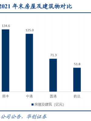 1)资源投入的高壁垒 a)顺丰的固定资产显著高于通达系同行 2021 年末各家公司固定资产净额看,顺丰(369 亿)>中通(258 亿)>韵达(138 亿)>圆通(126 亿)>申通(57 亿),京东物流因房屋及建筑物以租赁地址安排为主,故其固定资产净额仅为 86 亿。