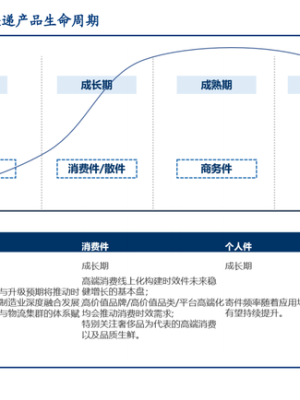 市场对顺丰时效快递的增长潜力存在担忧,但我们认为顺丰时效快递业务尚未展现完全 形态,其内涵会不断延伸扩展,而对其潜力的分析要从不同品类入手观察所处的不同产 业周期。 我们认为: 商务件进入成熟期:未来保持与 GDP 相仿的增速; 消费件处于成长期:我们预计随着高端消费线上渗透率的持续提升和生鲜食品等重要细 分领域的持续增长,长期看消费类时效件增速将维持在 10%以上;