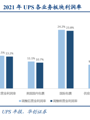 1)收入角度看:国际业务已经孵化为 UPS 第二增长曲线 2021 年 UPS 国内包裹、国际包裹及供应链收入分别达到 603.2、195.4、174.3 亿美元, 占总收入的比重分别为 62%、20.1%、17.9%。 收入增速看:1996-2021 年(上市后披露数据以来),UPS 整体营业收入、国内包裹、国 际包裹及供应链业务复合增速分别达到 6.1%、4.8%、7.7%、16.1%,国际业务增速高于 整体及国内业务,1998-2008 年国际业务增速更是持续停止高于整体及国内业务。收入结构看:1996-2021 年,UPS 国际业务占营收比重从 13.7%一度提升至 23.1%,随后 近 5 年均稳定在 20%左右。全球业务的扩张为 UPS 提供了更有力的收入增长驱动。