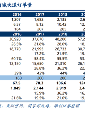 我们此前报告测算天猫商城日均单量约 5000 万单。 根据天猫公布的双十一销售金额及物流订单数据,可知天猫双十一期间客单价维持在约200 元/单,2020 年提升至 215 元。依据该数据我们假设天猫电商 2016-2021 年客单价约 为 180-220 元,2021 年对应快递订单量约为 183 亿,日均单量约为 5000 万单,占快递全 行业单量的 17%。(与同样代表品质电商消费的京东电商 GMV 市占率匹配)。 假设天猫商城代表了行业一半的品质需求,则整体体量在日均 1 亿单,占行业比重约三 成。