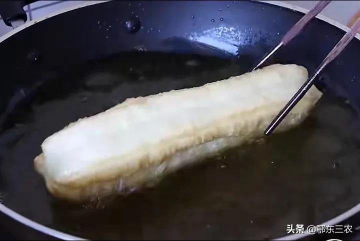 再起锅烧油,使食用油温度达到100℃左右的时候,将一根油条坯子向两端拉长一些,放入油锅炸制。油条在油锅内受热,逐渐膨大,用筷子翻动油条,避免油条炸糊。