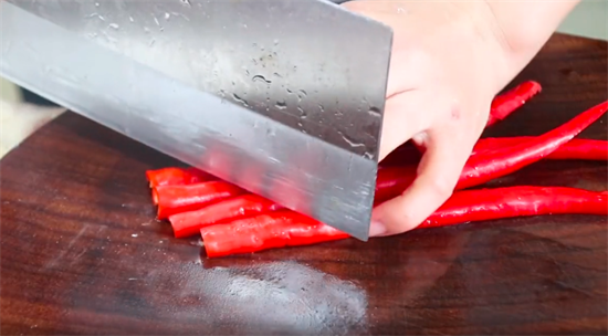 4.将两个红辣椒从中间剖开,去掉里面的籽,切成段。几颗大蒜切成片备用,大葱切段备用。