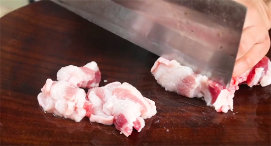 3.准备一小块五花肉切片备用。如果你准备的是冻肉,直接切比较好切。如果是新鲜肉,刀工一般的话,可以提前冷冻一下再切。