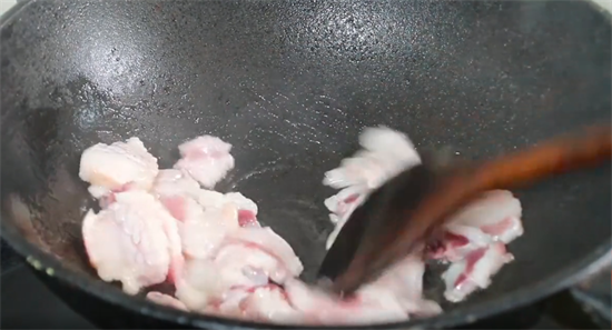5.锅里少放点油,先将五花肉放进去煸炒一下,释放出里面的油脂。等到肉变得颜色金黄,就可以将里面多余的油倒出来一些。