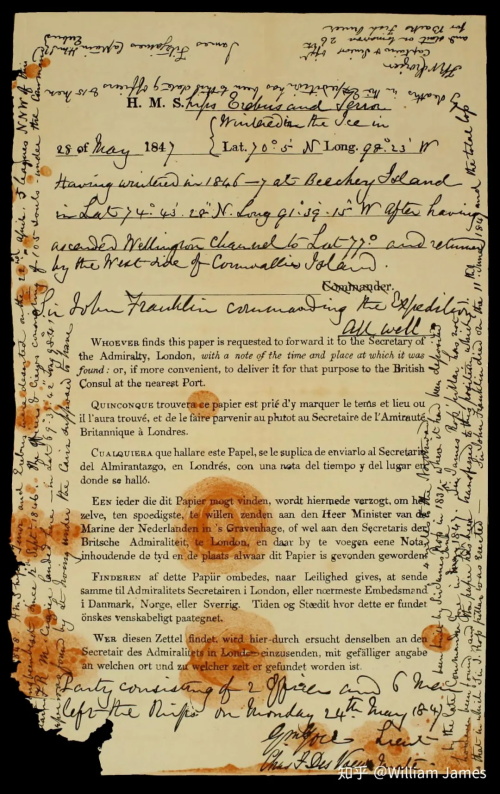最后,在1859年5月,由皇家海军麦克林托克上尉指挥的搜索队在威廉王岛的中部发现了一座用石头垒起来的标志物,在石碑底部,搜索队发现了一页关键性的、最终揭示了富兰克林探险队命运的英国皇家海军航海日志。