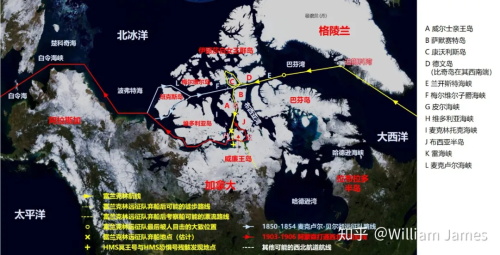 富兰克林爵士的航行路线,搜索队的搜索路线,以及最后挪威探险家阿蒙森的成功穿越路线(图源:知乎@William James)