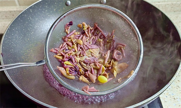 3.取适量的葡萄粒,用榨汁机榨成果汁,倒入锅中,也可以直接用清水,将葡萄皮放入锅中,调为中火,将葡萄汁煮开后,调为小火,将果汁煮成紫红色后,关火,用漏勺将葡萄皮捞出,再用铲子压一下葡萄皮里残留的果汁,然后将葡萄皮丢掉。