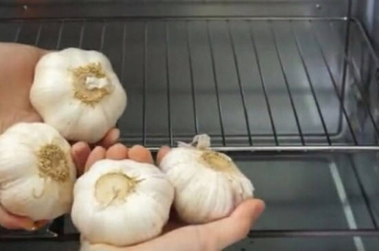 将干燥的大蒜放在烤盘上,把烤箱预热10分钟之后,将烤箱的温度设置在45℃左右,此时把大蒜放入烤箱中烘烤15分钟再取出。