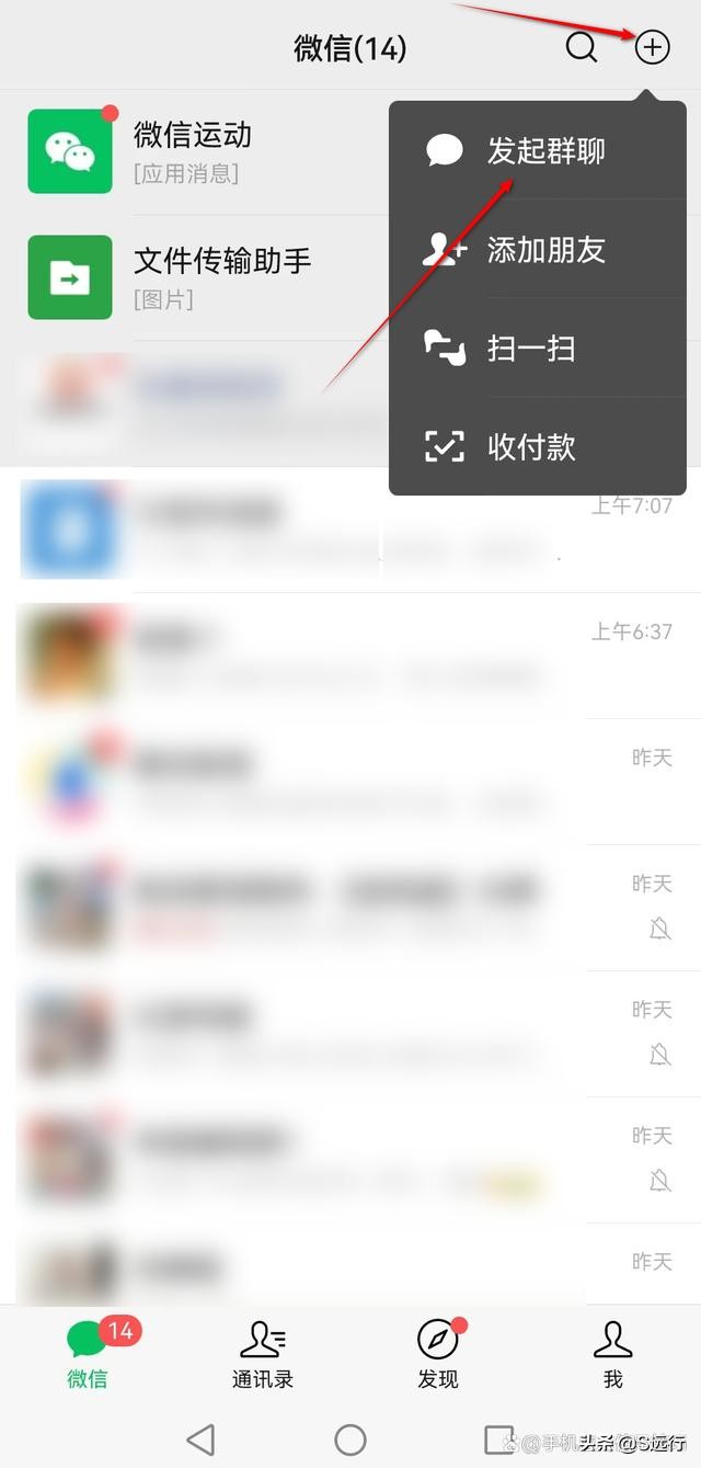 在微信界面点击右上角的“+”,点击“发起群聊”。